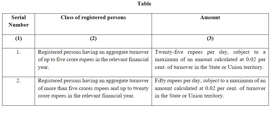 S.O…… (E). In exercise of the powers conferred by section 128 of the Central Goods and Services Tax Act, 2017 (12 of 2017)(herein after referred to as the said Act), the Central Government, on the recommendations of the Council, hereby waives the amount of late fee referred to in section 47 of the said Act in respect of the return to be furnished under section 44 of the said Act for the financial year 2022-23 onwards, which is in excess of amount as specified in Column (3) of the Table below, for the classes of registered persons mentioned in the corresponding entry in Column(2) of the Table below, who fails to furnish the return by the due date, namely:-