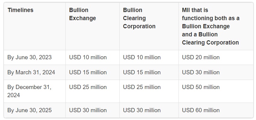 6. Accordingly, in order to ensure that the net worth of a Bullion Exchange and a Bullion Clearing Corporation is sufficient to accommodate the technological advancements in trading platforms and, the nature and expected growth of its business including the leveraged products it may offer, and to ensure that its net worth adequately captures the risks it faces, it has been decided to increase their net worth requirements in a gradual manner. The Bullion Exchange and the Bullion Clearing Corporation shall be required to maintain, at all times, a minimum net worth as specified in the table below: